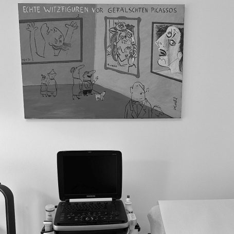Original-Gemälde aus dem Bereich der "Komischen Kunst" schmücken die Räumlichkeiten und tragen dazu bei, dass Sie sich wohlfühlen. Auch wenn Lachen nicht in allen Fällen die BESTE Medizin ist, macht Humor die Erkrankung erträglicher.